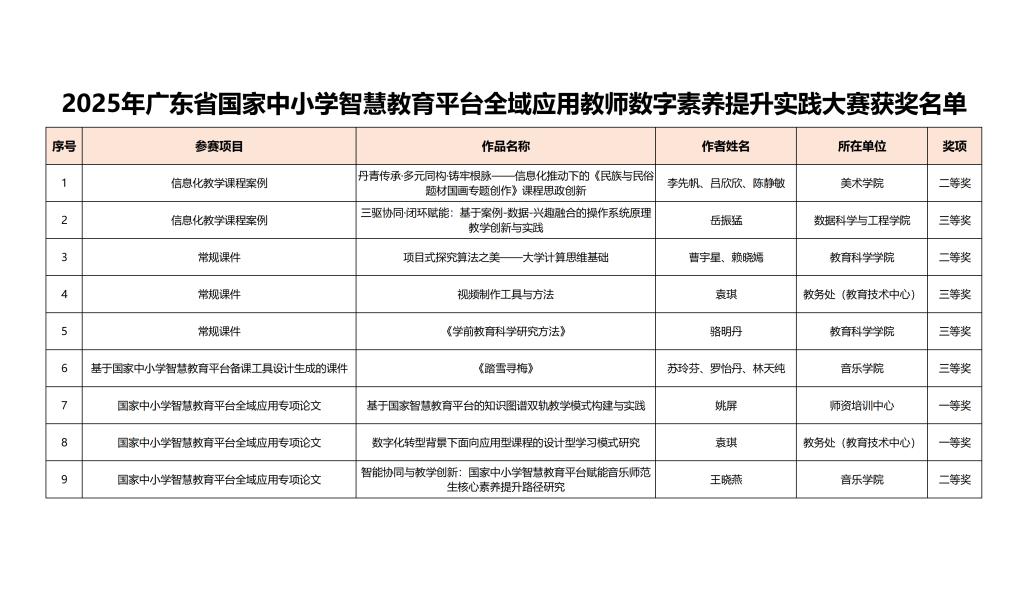 根據《關于2025年廣東省國家中小學智慧教育平臺全域應用教師數字素養(yǎng)提升實踐大賽獲獎名單及報送全國交流名單的公示》,我校教師在此次大賽中表現優(yōu)異,共獲9項榮譽,其中一等獎2項、二等獎3項、三等獎4項,涵蓋課程案例、常規(guī)課件、專項論文等多個項目。本次大賽以“人工智能賦能高質量課堂”為主題,旨在全面落實國家教育數字化戰(zhàn)略行動,推動教師數字素養(yǎng)提升與教育教學創(chuàng)新。自2025年4月大賽啟動以來,我校高度重視,由教務...